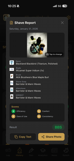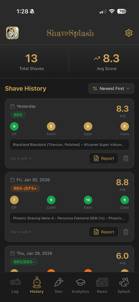 You can track shaves quantitatively (1–10 scoring, multiple categories) and qualitatively (DFS, BBS, irritation notes, and more). Presets are included, but everything is customizable, and your results roll into analytics so you can spot patterns over time.
